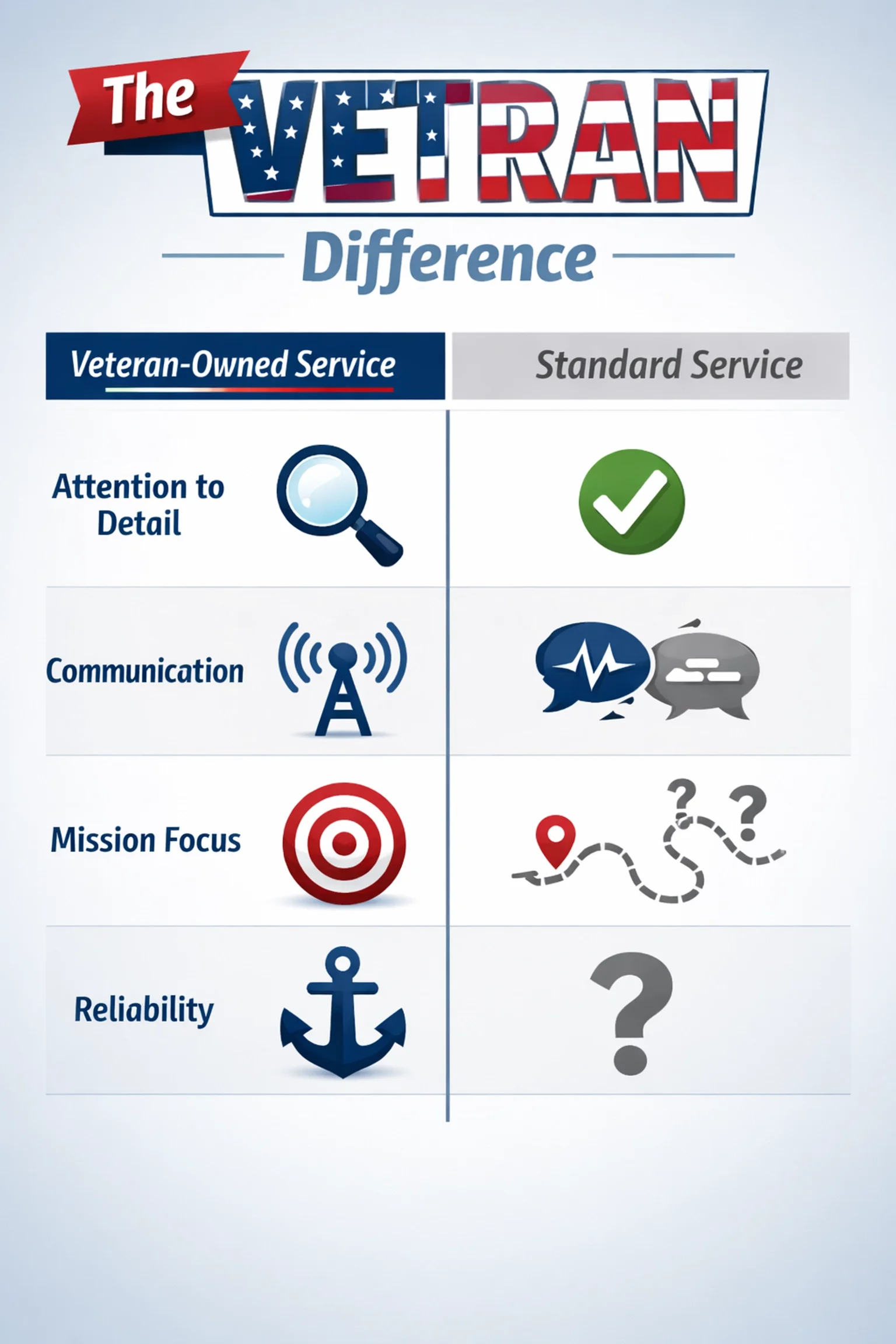 Not all service companies are created equal. And while we'd never disparage other contractors, the reality is that veteran-owned businesses operate differently. Here's a side-by-side look at what you can expect: